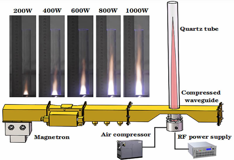 Diagrama esquemático de un prototipo de propulsor de plasma de aire. Este dispositivo consta de una fuente de alimentación de microondas, un compresor de aire, una guía de ondas de microondas comprimido y un encendedor de llama. Crédito: Jau Tang y Jun Li.